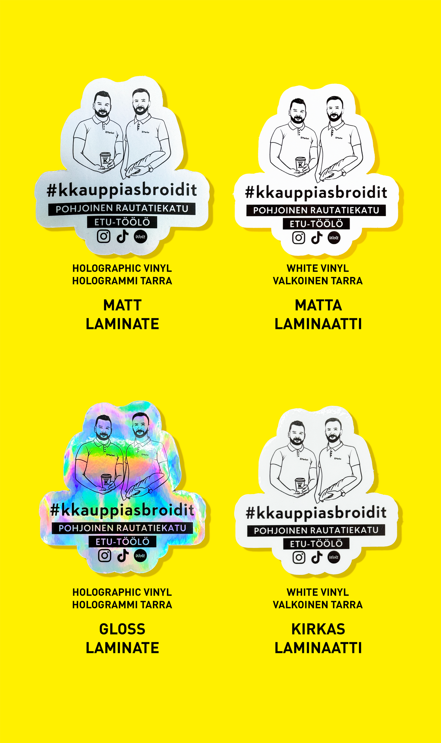 Me ei tehdä tarroja “paljaalle” vinyylille, vaan viimeistellään kaikki tarrat laminaatilla. Tämä tuo sekä kestävyyttä että paremman fiiliksen kädessä.